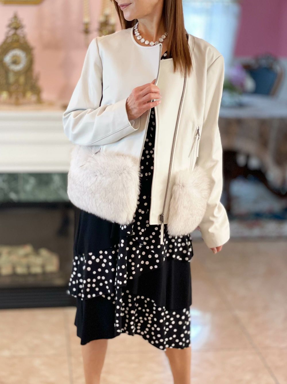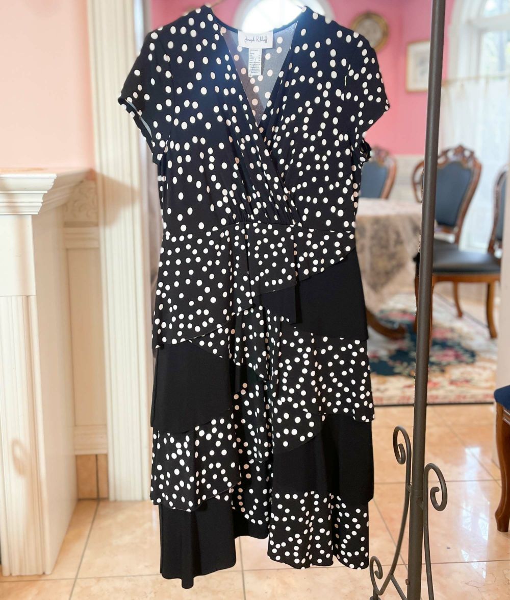 ■商品説明カナダのファッションブランド「Joseph Ribkoff」ワンピース。白黒の水玉と黒無地が織り成すデザインがシャープなスタイルを演出しています。